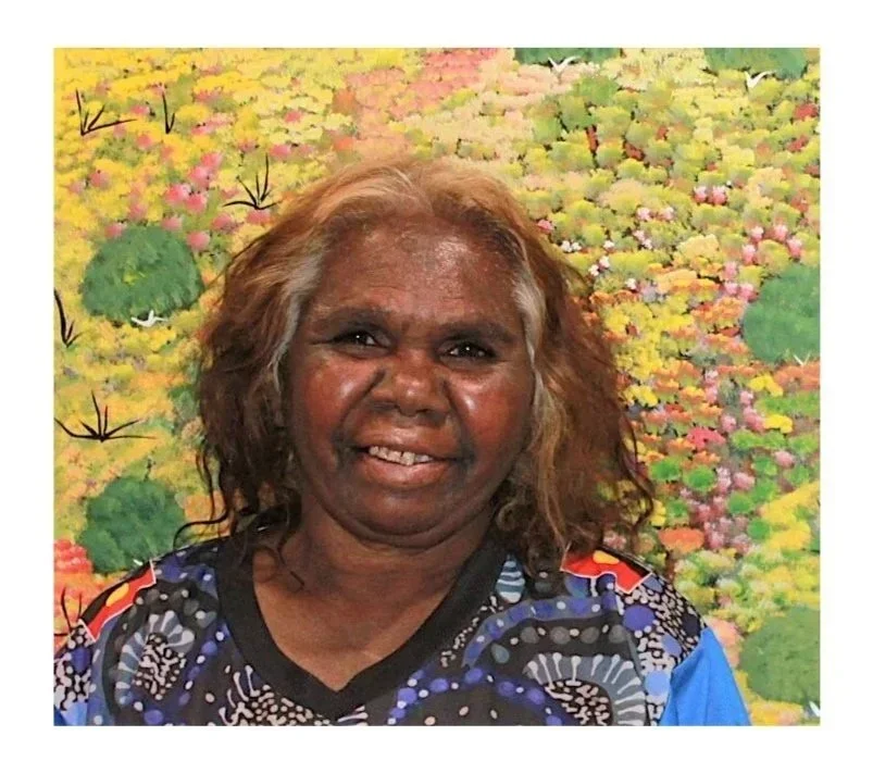 In 2021 Ada moved closer to her children and grandchildren who are living in the tiny out station of Wettengerr in the Epenarra Community in the Barkly Region of Central Australia. Wutunugurra (Wetenngerr) is Ada’s Grandfather and father’s ancestral country, it lies on Alyawarr land approximately 500 kms north east of Alice Springs. Ada first put brush to canvas in 2012, her application of layers of colour especially different shades of green resulted in amazing images of ‘English style gardens’. Incredibly, with the right amount of rain the arid landscape of Central Australia does take on these wonderful scenes of fields of flowers that seem like they were purposely planted out in planned garden beds.