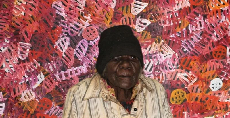 Emily Pwerle is an Anmatyerre / Alyawarra woman born c.1920 on her fathers’ traditional country Atnwengerrp. Emily now lives in Irrultja, a tiny settlement of about 100 people situated in Utopia, a region of central Australia approx. 350 km north east of Alice Springs. She has had little exposure to western culture and only picked up a paintbrush for the first time in 2004.